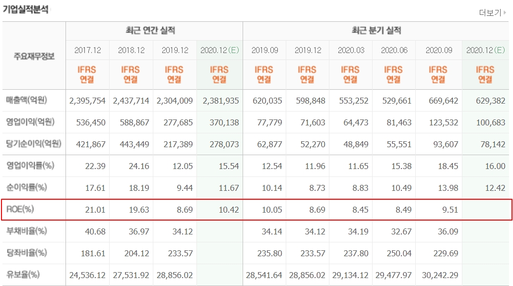 ROE(자기자본이익율)은 주주들이 투자한 돈으로 얼마나 벌고 있는지 보여주는 지표인데요. 기업의 수익성을 나타내는 지표입니다. 삼성전자 ROE(Return On Equity)는 현재 10.42%입니다. 예를들면 100원 투자금으로 10원 이상을 벌고 있는 셈입니다. PBR과 PER는 주가와 비교하는 것으로 낮을수록 좋지만 ROE는 수익률이므로 높을 수로 좋습니다.