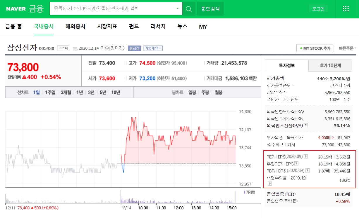 BPS와 PBR은 구글과 페이스북 같은 온라인 기업의 가치평가 방법으로 적합하지 않습니다. 주당순이익(EPS)는 기업의 이익 창출 능력을 파악하는 것입니다. EPS(Earnig Per Share)는 손익계산서의 당기순이익을 총 주식수로 나눈 값입니다. PER(Price Earning Ratio)는 현재 주가가 1주당 수익에 몇 배인지 알려주는 지표입니다. 삼성전자는 20.15배 입니다.