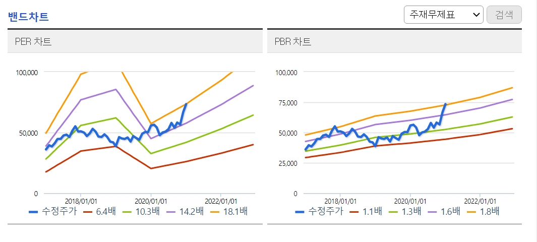 네이버 증권 종목분석 메뉴에서 PER 차트를 볼 수 있는데요. 삼성전자는 최근 PER가 20배까지 높아졌기 때문에 평균 PER에 비해 고평가 됐다고 말할 수 있습니다. PBR 차트도 삼성전자의 평균 PBR에 비해 높기 때문에 주식 가격이 고평가 되었다고 말할 수 있습니다. EPS와 BPS에 자신이 원하는 배수를 곱하면 매수하고자 하는 주식 가격을 알 수 있습니다.
